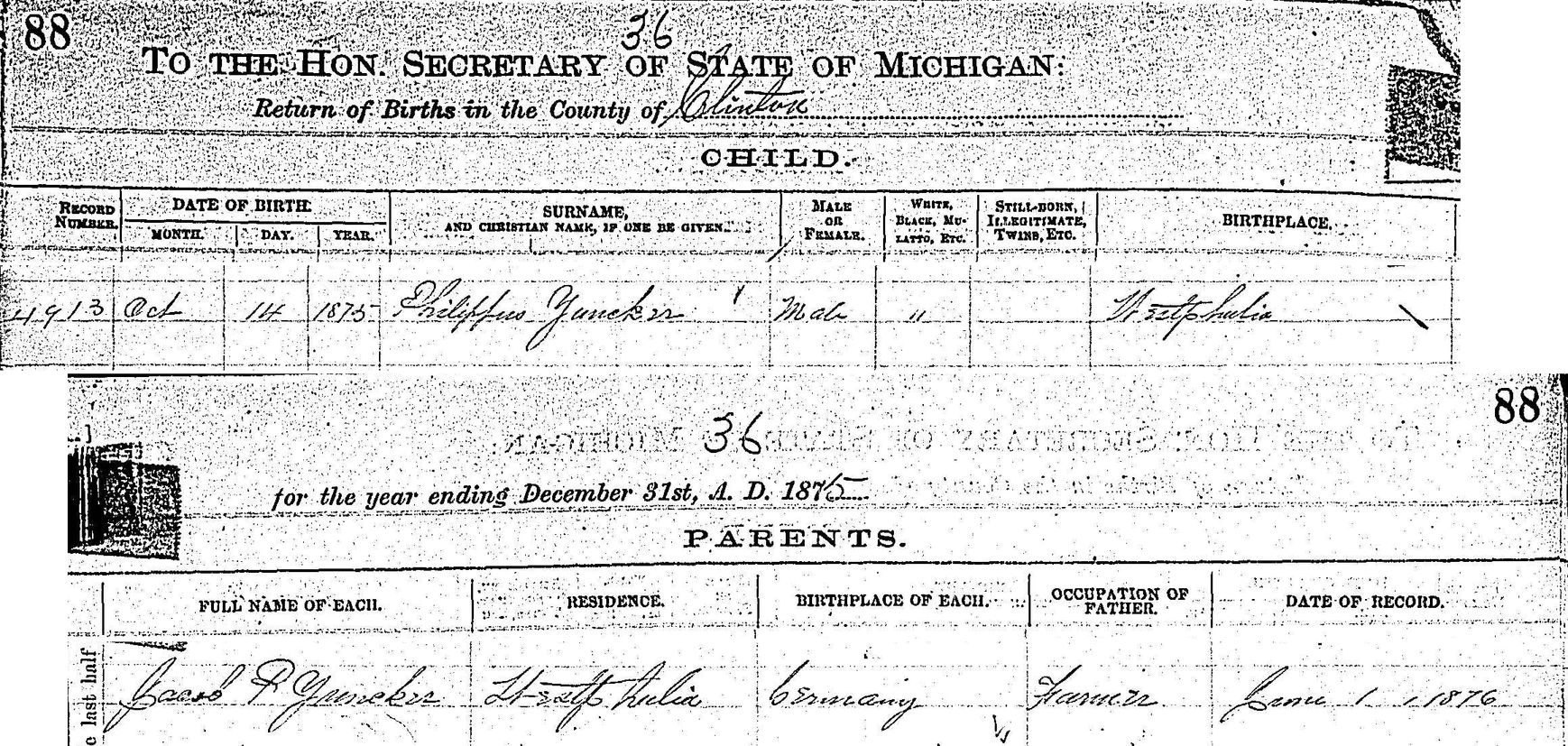 Source: Michigan, Michigan Births 1867-1902, Film 2320446; Digital GS 4206353; Image 445; Item 2; Page 88; Record 4913; Clinton County, Philippus Yuncker, 14 October 1875; digital images, FamilySearch and Genealogical Society of Utah, FamilySearch (http://FamilySearch.org : downloaded 22 February 2009).