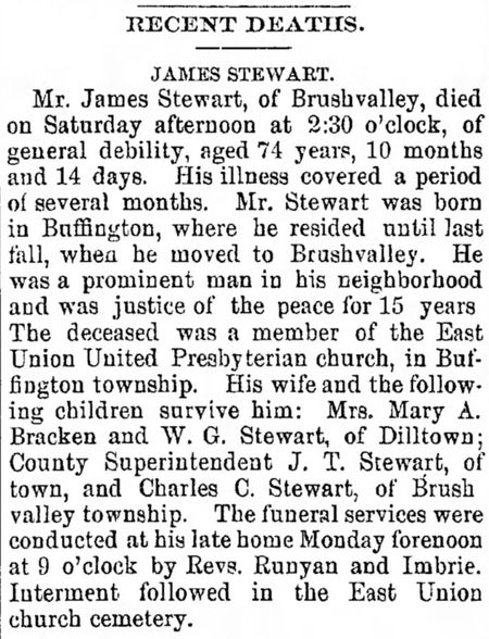 Source: "Recent Deaths. James Stewart.," Obituary, The Indiana (Pennsylvania) Progress, 23 August 1899, Page 4, Column 4; online archives (Newspapers.com : Downloaded 19 June 2016).