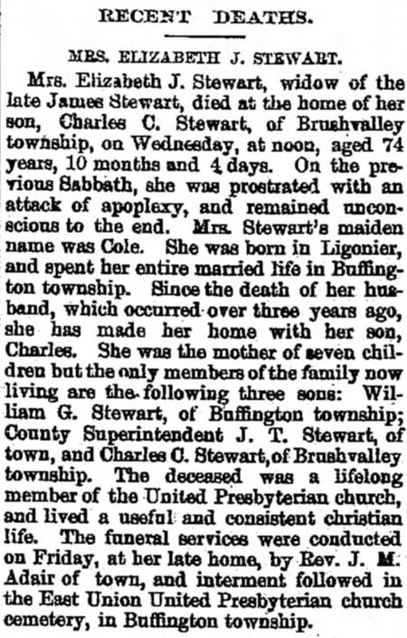 Source: "Recent Deaths. Mrs. Elizabeth J. Stewart," Obituary, The Indiana (Pennsylvania) Progress, 19 November 1902, Page 1, Column 5; online archives (Newspapers.com : downloaded 19 June 2016).