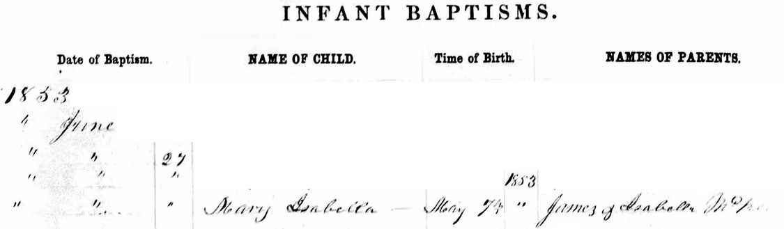 Baptism of Mary Isabella McKee [I02566], showing birth date of 7 May 1853.