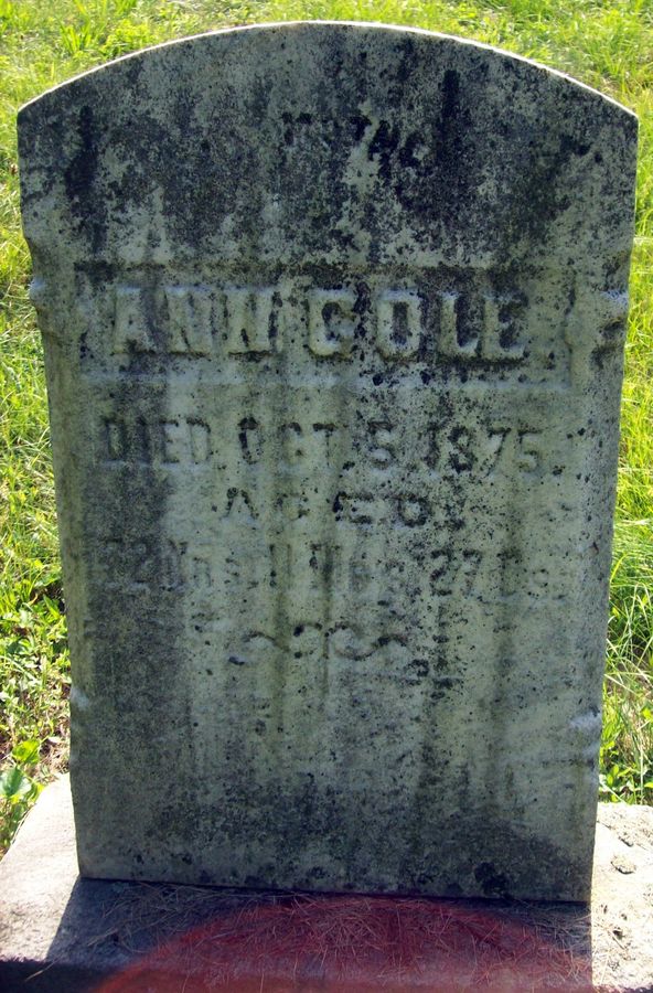 Source: Find A Grave, database and images (https://www.findagrave.com : accessed 11 June 2018), memorial page for Ann Cole (1802–5 Oct 1875), Find A Grave Memorial no. 133816465, citing East Union-McCartney Cemetery, Dilltown, Indiana County, Pennsylvania, USA ; Maintained by Rob and Debi Felten (contributor 46883097).