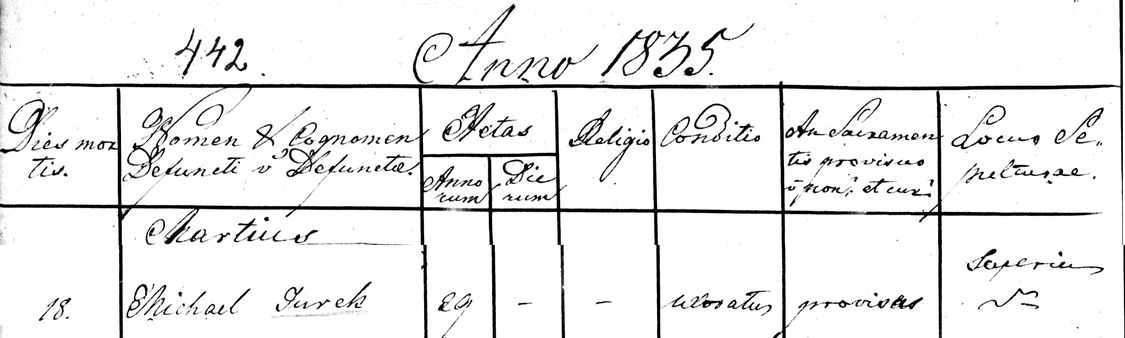 Death record for János Mihály Turek [I01937], who died March 18, 1835.