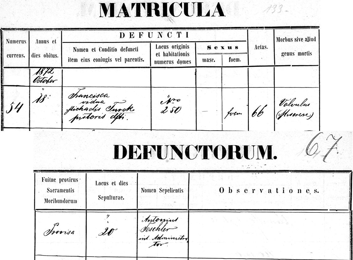 Death record for Franciska (Kremniczky) Turek [I01938], who died October 18, 1872.