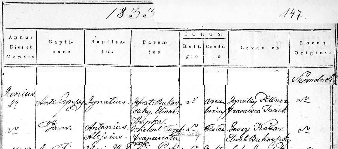 Source: "Slovakia Church and Synagogue Books, 1592-1910," database with images, FamilySearch (https://familysearch.org/ark:/61903/1:1:KZR4-DV1 : 24 February 2015), Antonius Alojsius Turek, 02 Jun 1833; citing Smolník, Gelnica, Slovakia, line , reference ID 147, state regional archives, Slovakia; FHL microfilm 1,791,530.