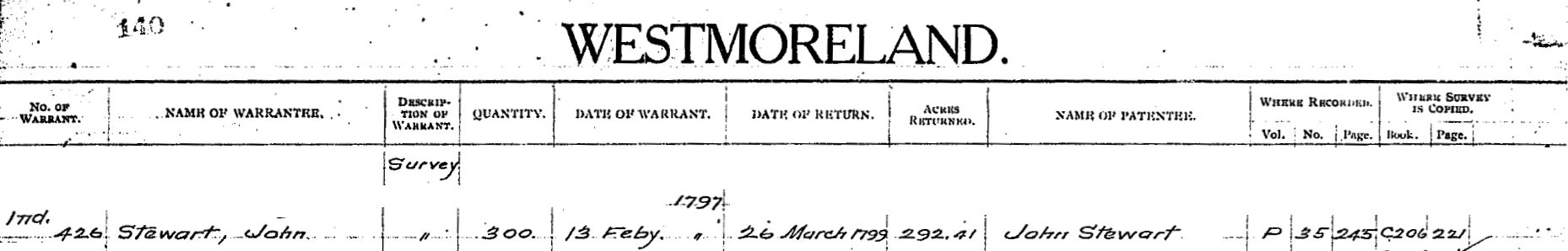 Source: Pennsylvania, "Warrant Registers, 1733-1957," database and digital images, Pennsylvania State Archives, Land Records (http://www.portal.state.pa.us/portal/server.pt/community/state_archives/2887 : downloaded 9 December 2009), RG-17, Series #17.88, Westmoreland County, Page 140, http://www.phmc.state.pa.us/bah/dam/rg/di/r17-88WarrantRegisters/WestmorelandPages/Westmoreland140.pdf; Pennsylvania Historical and Museum Commission, Bureau of Archives and History.