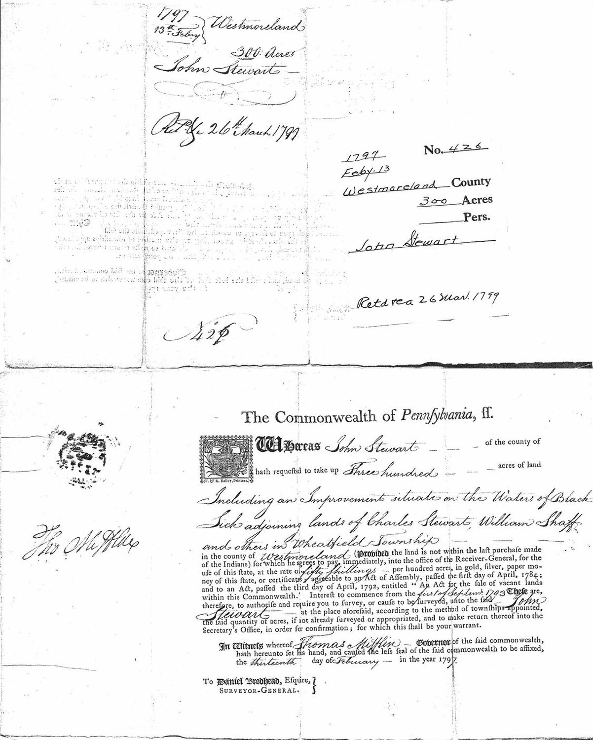 1797 13th Feb’ry Westmoreland 300 acres John Stewart Retd [...] 26th March 1797 No. 426.