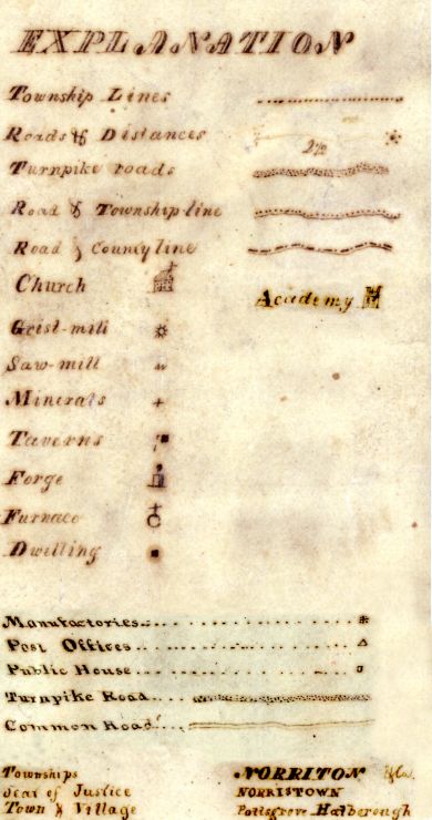 Source: Pennsylvania, "Melish-Whiteside Maps, 1816-1821, Record Group 17," digital images, Pennsylvania State Archives, Land Records (http://www.phmc.state.pa.us/bah/dam/rg/di/r17-534WhitesideMaps/r017-534WhitesideMapInterface.htm : downloaded 2 December 2010), Legend of map symbols; Pennsylvania Historical and Museum Commission, Bureau of Archives and History.