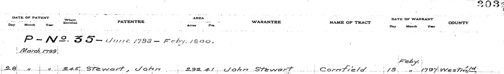 Source: Pennsylvania, "Patent Indexes, 1684-ca. 1957," database and digital images, Pennsylvania State Archives, Land Records (http://www.portal.state.pa.us/portal/server.pt/community/state_archives/2887 : downloaded 11 December 2009), RG-17, Series #17.155, Patent Index, P Series (P-20 to P-35), 1792-1800, P-35, Page 303, http://www.phmc.state.pa.us/bah/dam/rg/di/r17PatentIndexes/P1792-1800PatentIndex304.pdf; Pennsylvania Historical and Museum Commission, Bureau of Archives and History.