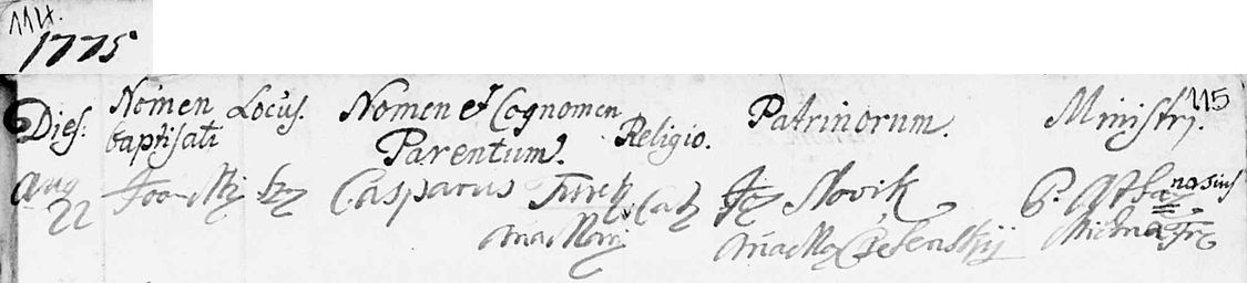 Birth record for János Mihály Turek [I01939], showing parents, Gáspár Turek [I01943] and Anna Mária Turek [I01944]. He was baptized 22 August 1775.