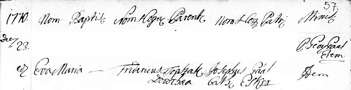Birth record for Éva Mária (Topschak) Kremniczky [I01942], showing parents, Frigyes Topschak [I01949] and Dorottya Topschak [I01950]. She was baptized December 23, 1770.