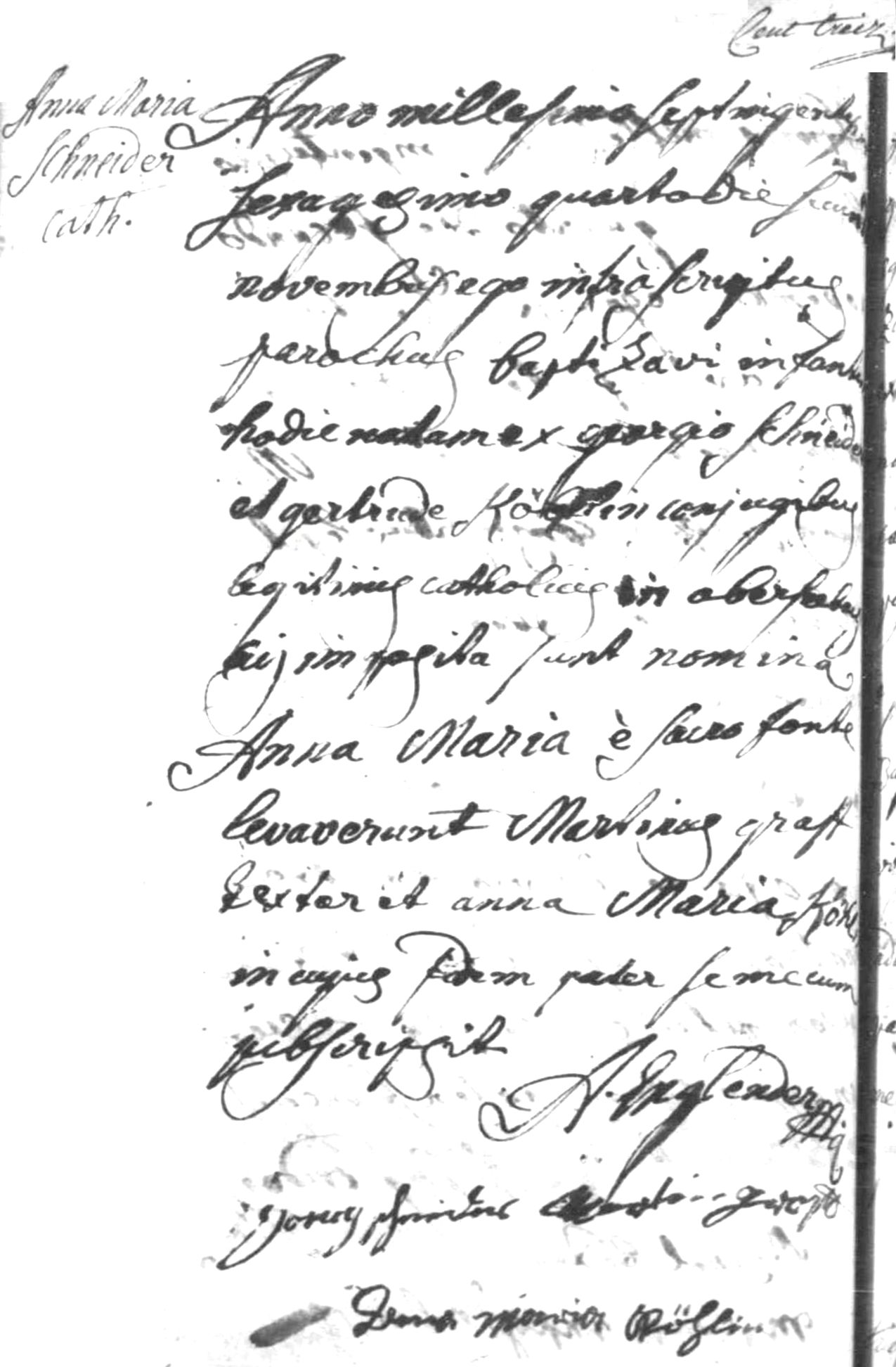 Source: Archives Départementles du Bas-Rhin (https://archives.bas-rhin.fr/) Oberseebach - Registres Paroissiaux (Avant 1793) - Paroisse catholique (Avant 1793) - Registre de baptêmes mariages sépultures 1756-1772 - 3 E 351/5, Baptism of Anna Maria Schneider, Oberseebach, 1764, Image 117 of 307, (https://archives.bas-rhin.fr/detail-document/ETAT-CIVIL-C595-P3-R208893#visio/page:ETAT-CIVIL-C595-P3-R208893-2281305 : downloaded 4 Apr 2023).