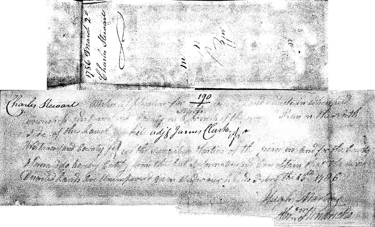 Charles Stewart makes application for 190 acres of land situate in Wheatfield Township Westmoreland County […] of the […] on the North side of the Laurel hill adj’t James Clarke of a […] Westmoreland County […] and for the county aforesaid do […] 15th 1786