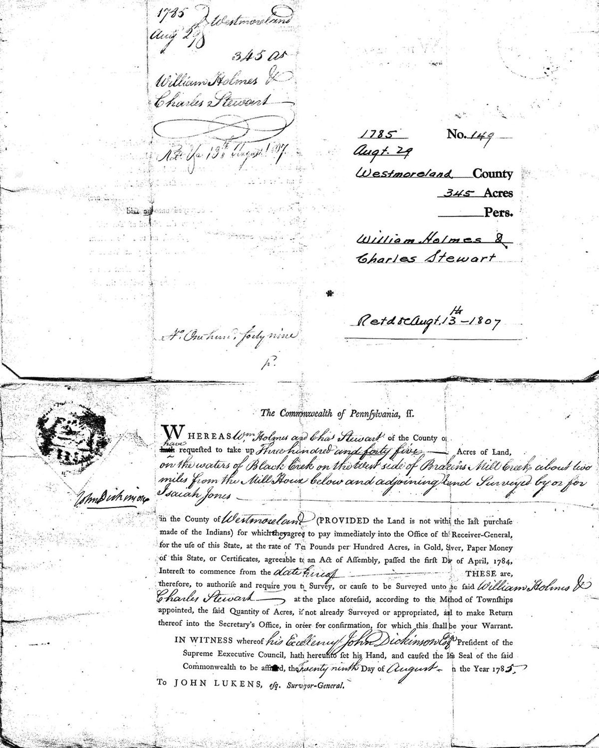 Whereas Wm Holmes and Chas Stewart of the County of ___ have requested to take up Three hundred and forty five Acres of Land, on the waters of Black Lick on the west side of Brakins Mill Creek about two miles from the Mill House below and adjoining land surveyed by or for Isaiah Jones in the County of Westmoreland (Provided the Land is not wihin the last purchase made of the Indians) for which they agree to pay immediately into the Office of the Receiver-General, for the use of this State, at the rate of Ten Pounds per Hundred Acres, in Gold, Silver, Paper Money of this State, or Certificates, agreeable to an Act of Assembly, passed the first Day of April, 1784, Interest to commence from the date hereof These are, therefore, to authorise and require you to Survey, or cause to be Surveyed unto the said William Jolmes and Charles Stewart at the place aforesaid, according to the Method of Townships appointed, the said Quantity of Acres, if not already Surveyed or appropriated, and to make Return thereof into the Secretary’s Office, in order for confirmation, for which this shall be your Warrant.