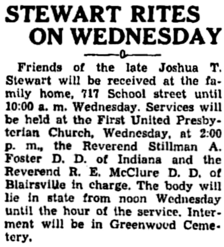 Friends of the late Joshua T. Stewart will be received at the family home, 717 School street until 10:00 a. m. Wednesday. Services will be held at the First United Presbyterian Church, Wednesday, at 2:00 p. m., the Reverend Stillman A. Foster D. D. of Indiana and the Reverend R. E. McClure D. D. of Blairsville in charge. The body will lie in state from noon Wednesday until the hour of the service. Interment will be in Greenwood Cemetery.