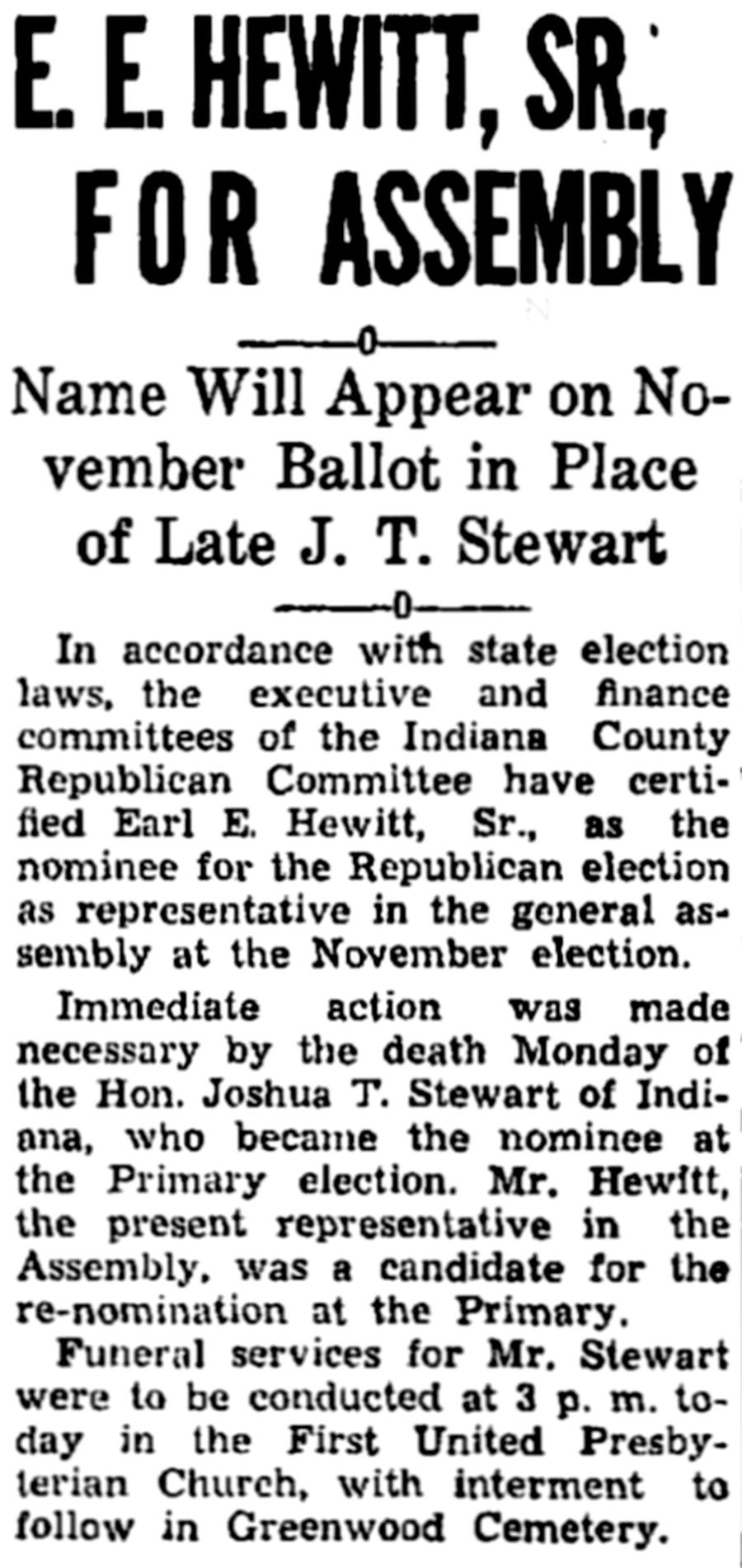 Immediate action was made necessary by the death Monday of the Hon. Joshua T. Stewart of Indiana, who became the nominee at the Primary election. Mr. Hewitt, the present representative in the Assembly, was a candidate for the re-nomination at the Primary.