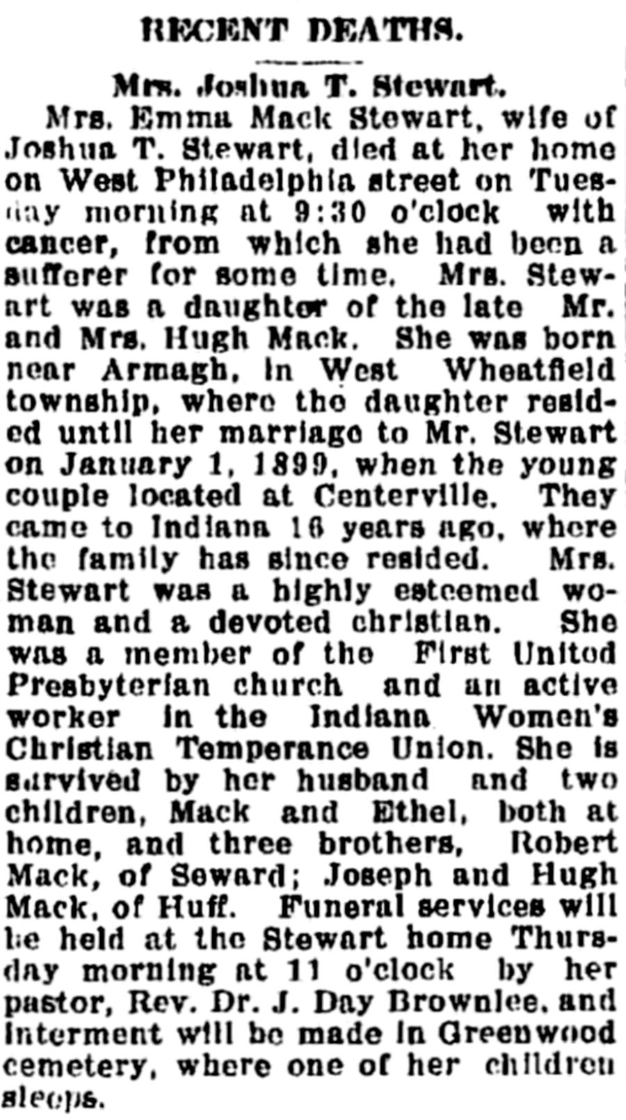 Mrs Emma Mack Stewart, wife of Joshua T. Stewart, died at her home on West Philadelphia street on Tuesday morning at 9:30 o'clock with cancer, from which she had been a sufferer for some time. Mrs. Stewart was a daughter of the late Mr. and Mrs. Hugh Mack. She was born near Armagh, in West Wheatfield township, where the daughter resided until her marriage to Mr. Stewart on January 1, 1899, when the young couple located at Centerville. They came to Indiana 16 years ago, where the family has since resided. Mrs. Stewart was a highly esteemed woman and a devoted christian. She was a member of the First United Presbyterian church and an active worker in the Indiana Women's Christian Temperance Union. She is survived by her husband and two children, Mack and Ethel, both at home, and three brothers, Robert Mack, of Seward; Joseph and Hugh Mack, of Huff. Funeral services will be held at the Stewart home Thursday morning at 11 o'clock by her pastor, Rev. Dr. J. Day Brownlee, and interment will be made in Greenwood cemetery, where one of her children sleeps.