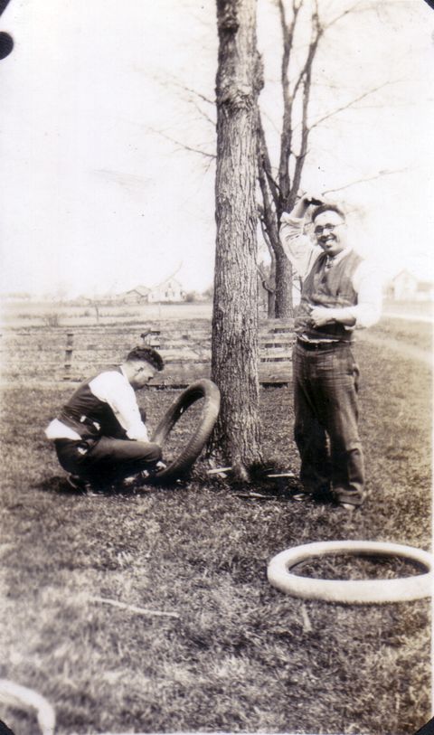 George John Voisin [00081], left, and Willard Joseph Voisin [00150] changing a flat tire from a Ford Model T automobile in front of the Voisin homestead in Beal City, Isabella, Michigan.