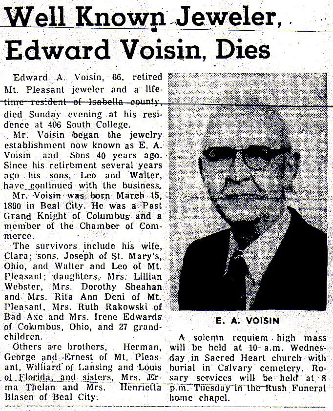 Source: Well Known Jeweler, Edward Voisin, Dies, Daily Times-News, Mount Pleasant, Isabella, Michigan, 5 November 1956, Volume 92, Number 288, Page 1, Column 3.
