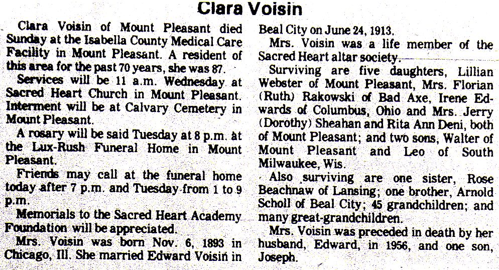 Clara Voisin of Mount Pleasant died Sunday at the Isabella County Medical Care facility in Mount Pleasant. A resident of this area for the past 70 years, she was 87.