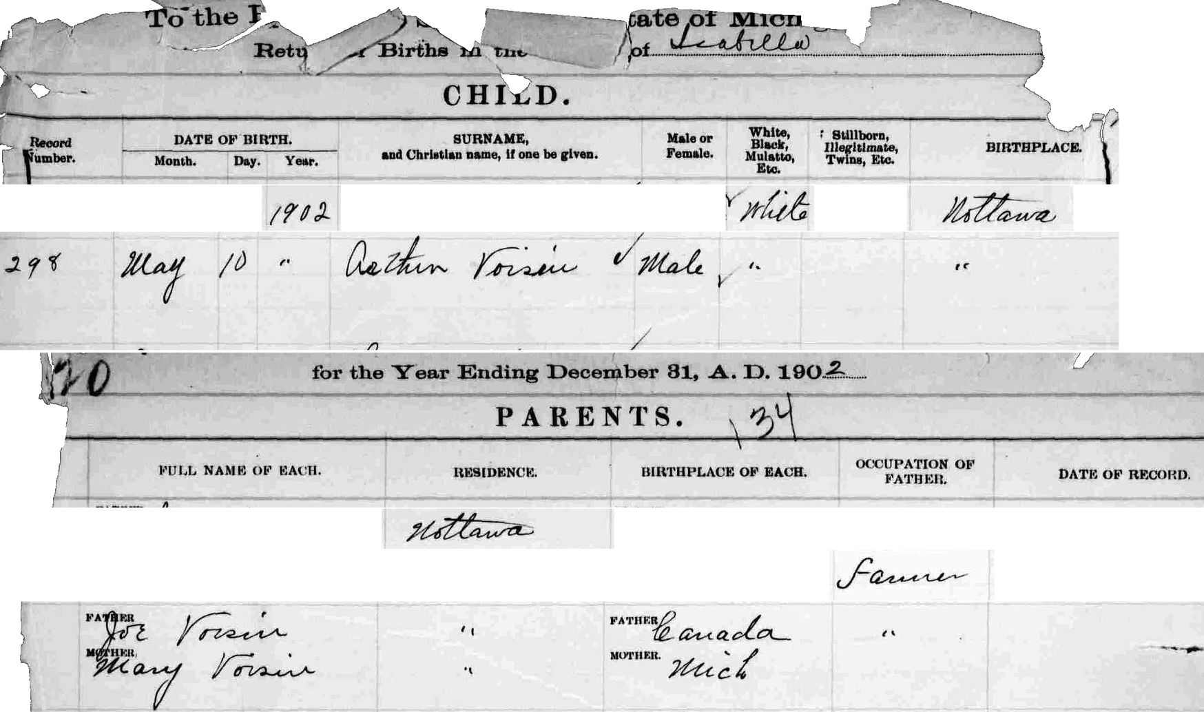 Source: Michigan, Michigan Births 1867-1902, Film 2363096; Digital GS 4032379; Image 604; Item 2; Page 134; Record 298; Isabella County, Arthur Voisin, 10 May 1902; digital images, FamilySearch and Genealogical Society of Utah, FamilySearch (http://FamilySearch.org : downloaded 5 November 2009).
