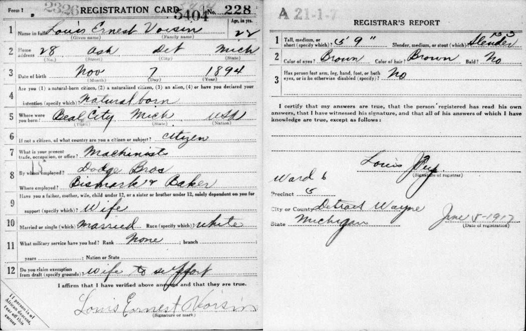 Source: "United States World War I Draft Registration Cards, 1917-1918," index and images, FamilySearch (https://familysearch.org : downloaded 2 April 2015), Louis Ernest Voisin, 1917-1918; citing , Detroit City no 7, Michigan, United States, NARA microfilm publication M1509 (Washington D.C.: National Archives and Records Administration, n.d.); FHL microfilm 2,024,031.