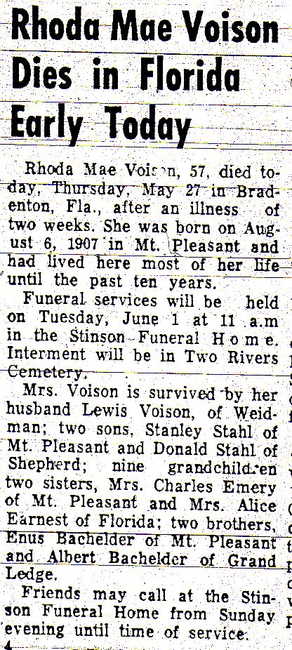 Source: Rhoda Mae Voison [sic] Dies in Florida Early Today, Daily Times-News, Mount Pleasant, Isabella, Michigan, 27 May 1965, Volume 101, Number 129, Page 2, Column 2.