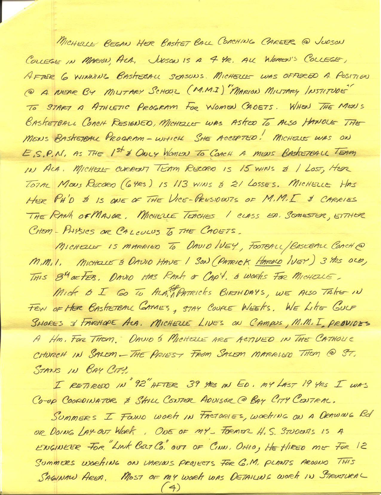 Michelle began her basket ball coaching career @ Judson College in Marion, Ala. Judson is a 4 yr. all women’s college, after 6 winning basketball seasons Michelle was offered a position @ a near by military school (M.M.I.) “Marion Military Institude” to start a athletic program for women cadets. When the mens basketball coach resigned, Michelle was asked to also handle the mens basketball program—which she accepted! Michelle was on E.S.P.N. as the 1st & only women to coach a mens basketball team in Ala. Michelle current team record is 15 wins & 1 lost, her total mens record (6 yrs) is 113 wins & 21 losses. Michelle has here PH’D & is one of the vice-presidents of M.M.I. & carries the rank of Major. Michelle teaches 1 class ea. Semester, either Chem-Physics or Calculus to the cadets.