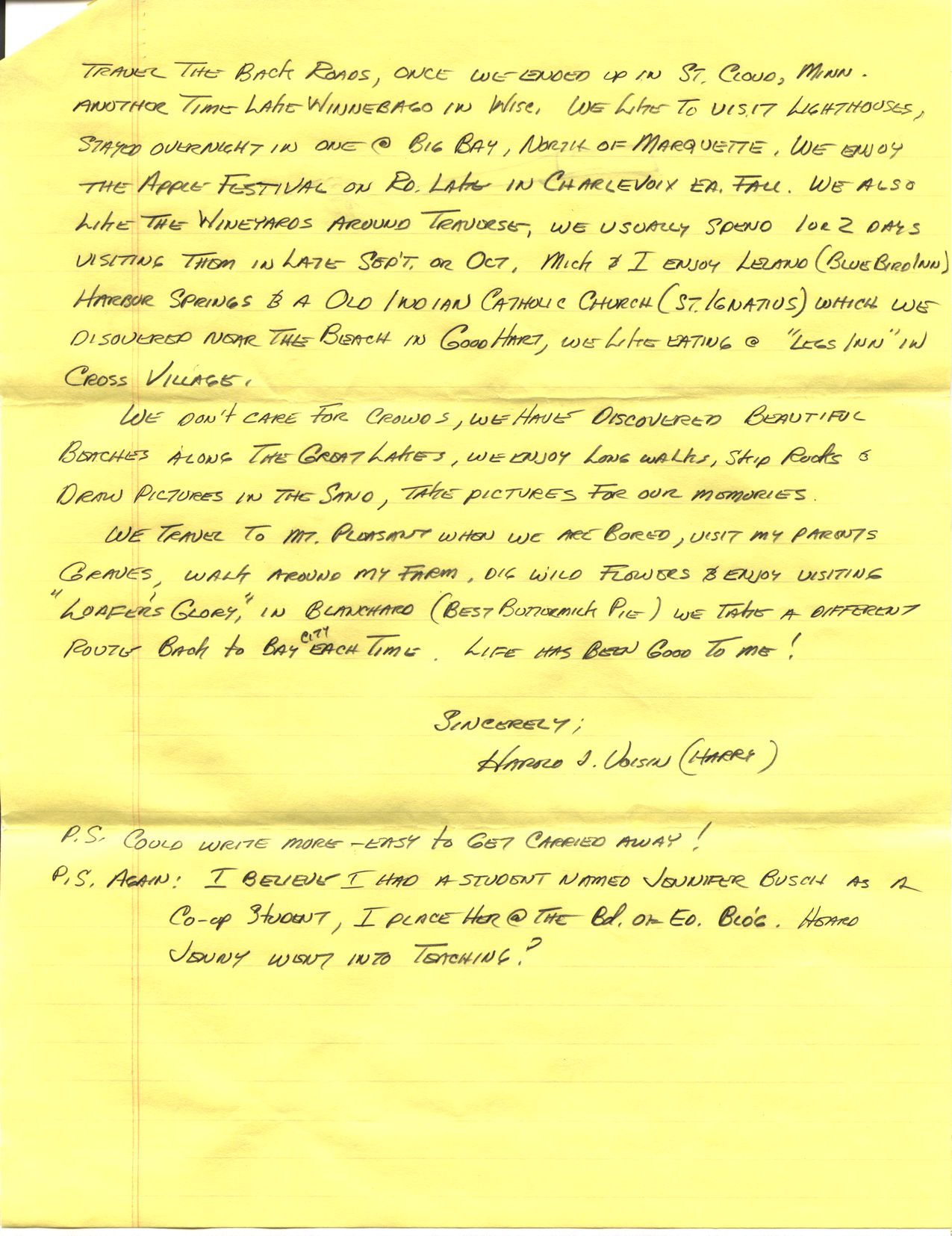 travel the back roads, once we ended up in St. Cloud, Minn. Another time Lake Winnebago in Wisc. We like to visit lighthouses, stayed overnight in one @ Big Bay, north of Marquette. We enjoy the Apple Festival on Rd. Lake in Charlevoix ea. Fall. We also like the Wineyards around Traverse. We usually spend 1 or 2 days visiting them in late Sep’t or Oct. Mick & I enjoy Leland (Blue Bird Inn) Harbor Springs & a old Indian Catholic Church (St. Ignatius) which we discovered near the beach in Good Hart, we like eating @ “Legs Inn” in Cross Village.