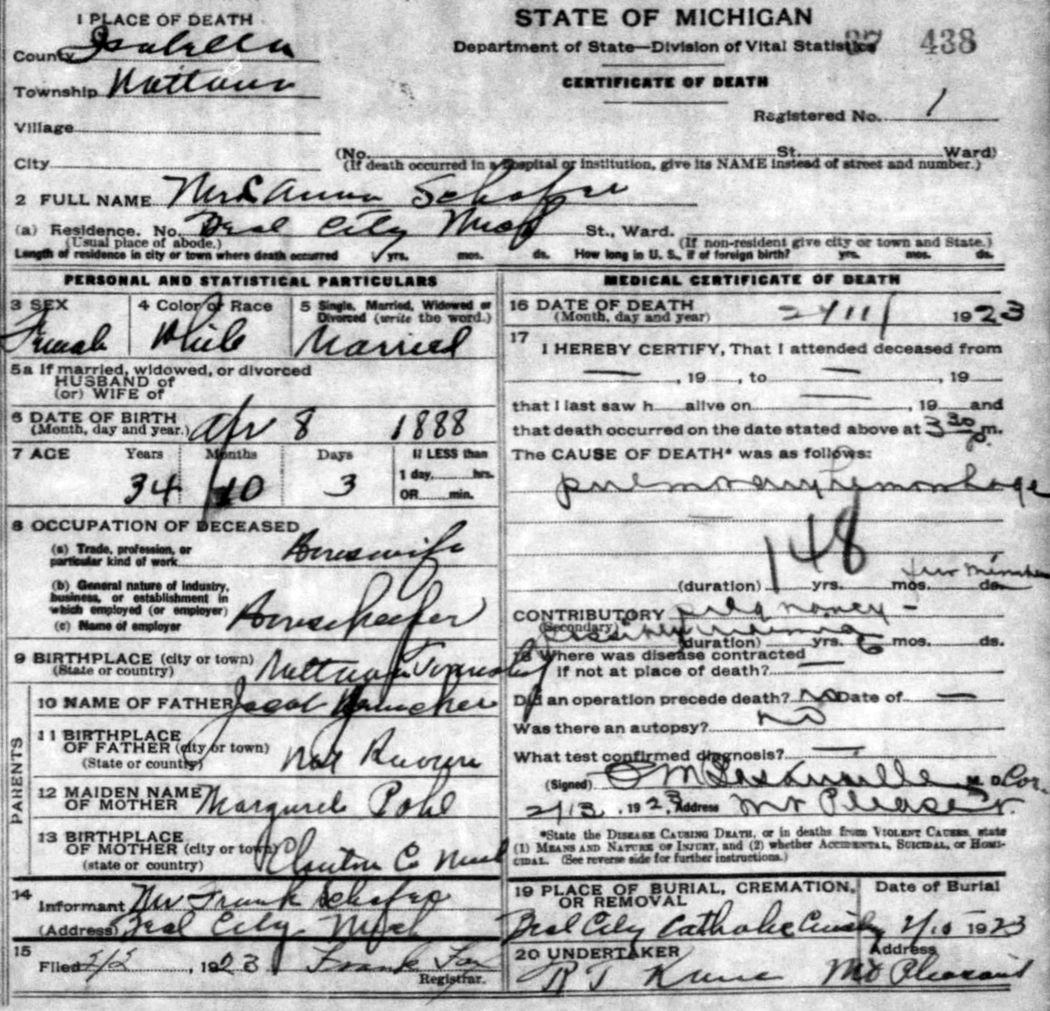 Source: Michigan Michigan History Foundation, "Death Records, 1921-1947," death certificates, Seeking Michigan (http://seekingmichigan.org/ : Downloaded 28 July 2016), C Anna Schafer, 11 Feb 1923.