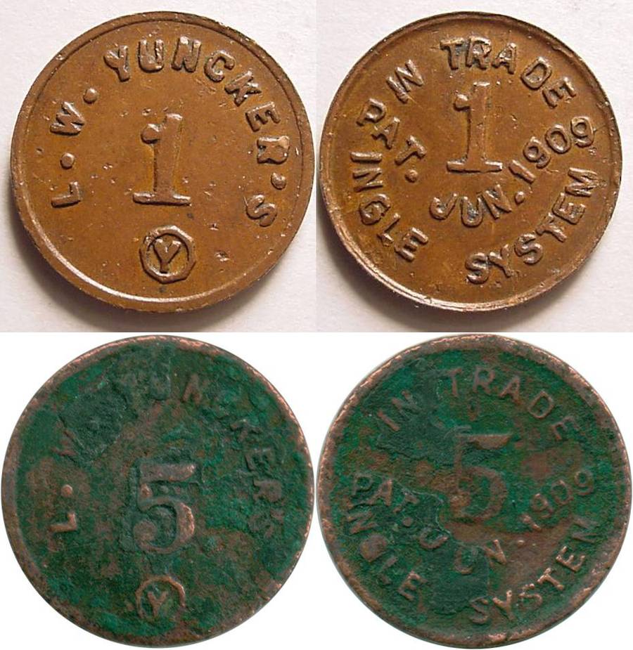 Source: Richard Greever, Token Catalog (http://tokencatalog.com/index.php : downloaded 19 March 2015), L. W. Yuncker's trade tokens, TokenCatalog #10252 and #312386.