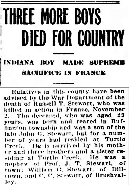 Source: "Three More Boys Died for Country," Article, The Indiana (Pennsylvania) Progress, 18 December 1918, Russell T. Stewart killed in action, Page 1; online archives (Newspapers.com : downloaded 19 June 2016).