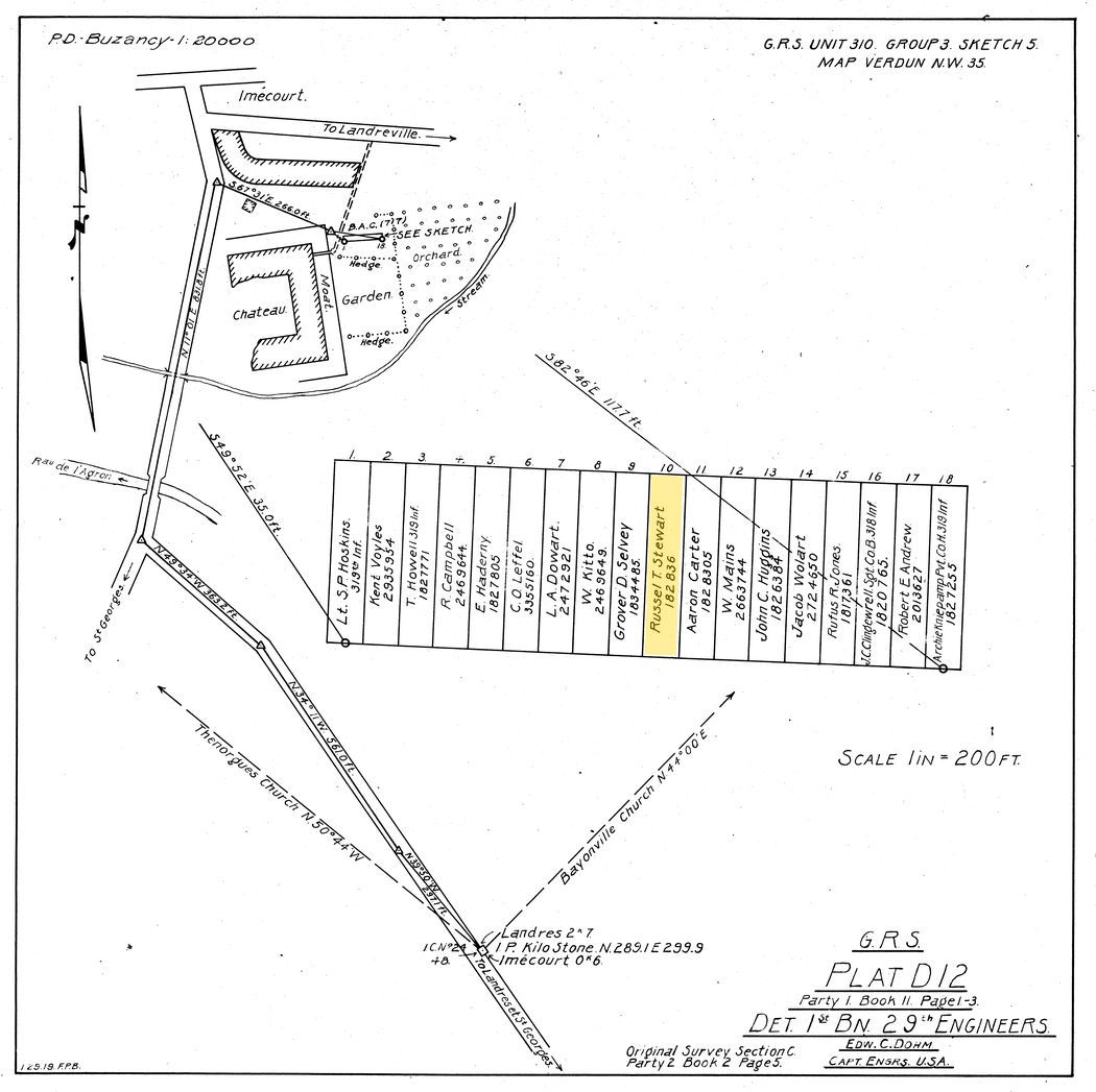A makeshift cemetery, Army Cemetery 717, was set near the garden of this once grand estate. After the war, these graves were meticulously surveyed as to their exact location and the identities of those buried there. In this survey, the ruins of the Chateau are shown with the western side of the structure demolished. On the east side was a garden and orchard. The cemetery was a small rectangular area near a hedge with the words "see sketch." The graves in that area are shown as a large inset sketch. Russell Stewart was buried here in grave number 10.