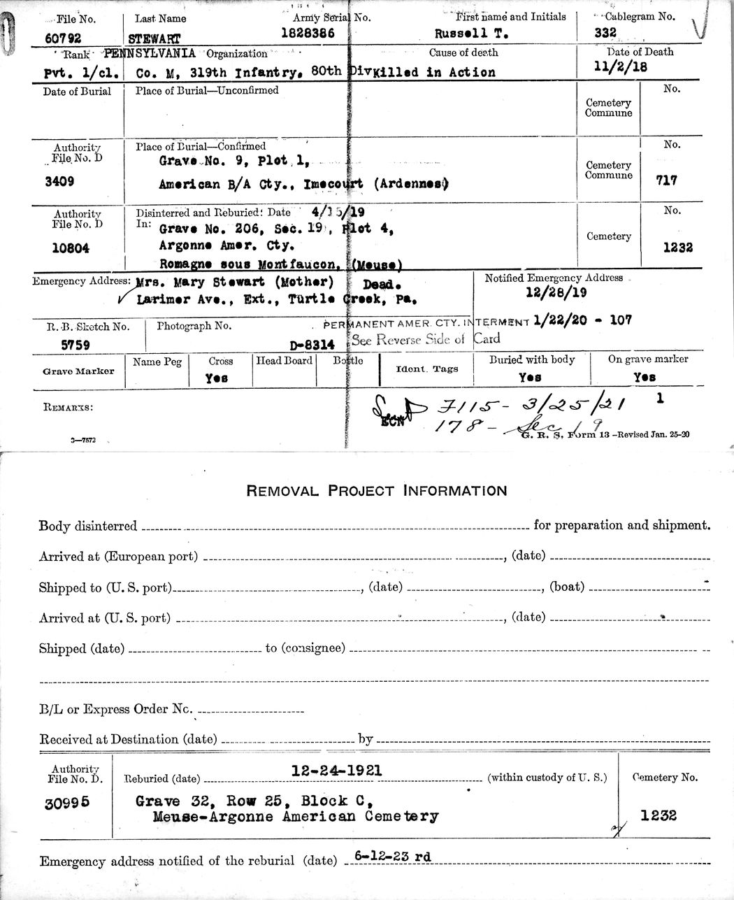 Disposition of the remains of Russell Thomas Stewart [I00240] after World War I. This burial record card indicates Russell was buried, then exhumed and reburied twice.