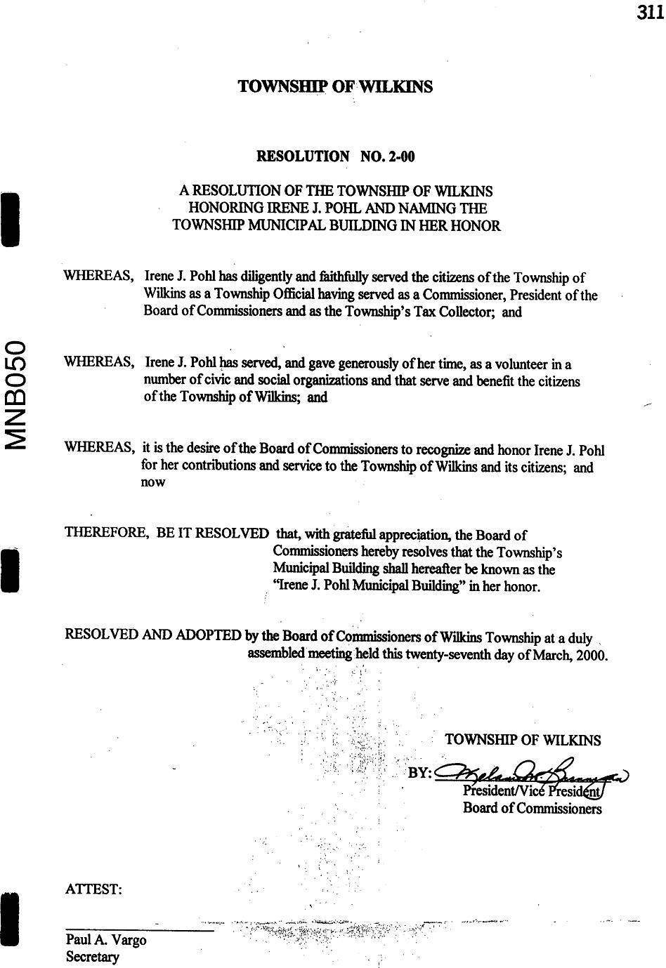 A resolution adopted by the Wilkins Township Board of Commissioners, Allegheny County, Pennsylvania, which renamed the township municipal building in honor of Irene J. Pohl [01267]. Ms. Pohl served the local community for many years in different capacities. According to her obituary [000775], these included Administrator for the District Justice Court System of Allegheny County, Executive Secretary in the Allegheny County Public Defenders Office, President of the Board of Commissioners of Wilkins Township, Wilkins Township representative on the Turtle Creek Valley Council of Government, and Tax Collector in Wilkins Township.