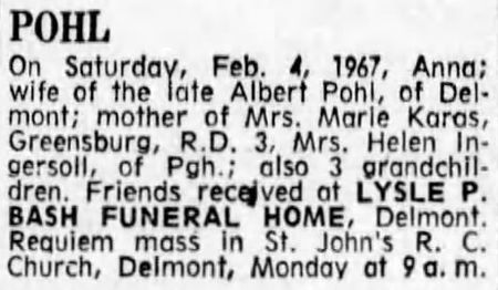 Source: "Death Notices," Obituary, The Pittsburgh (Pennsylvania) Press, 5 February 1967, Pohl, Page 6, Section 3, Column 3; online archives (Newspapers.com : downloaded 21 June 2016).