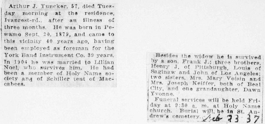 Arthur J. Yuncker, 57, died Tuesday morning at the residence, Ivanrest-rd., after an illness of three months. He was born in Pewamo Sept. 20, 1879, and came to this vicinity 40 years ago, having been employed as foreman for the York Band Instrument Co. 39 years. In 1904 he was married to Lillian Noel, who survives him. He had been a member of Holy Name Society and of Schiller tent of Maccabees.