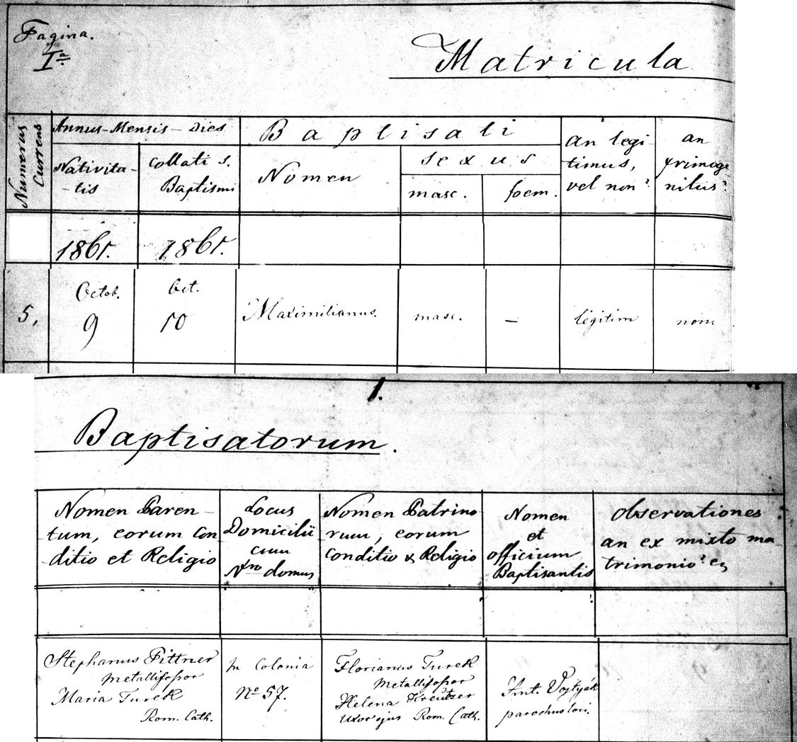 Baptism record for Maximilian Pittner [I01952], showing birth date of 9 October 1861.