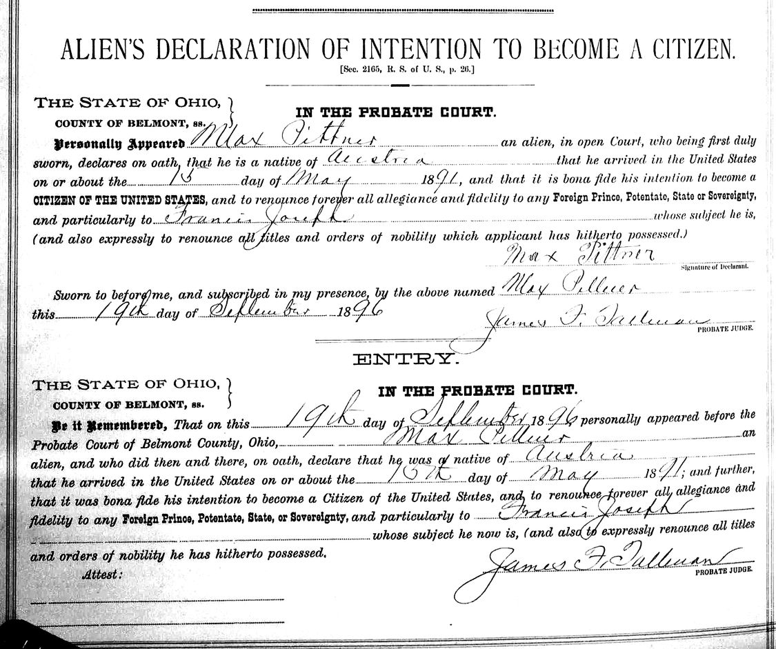 Declaration of intention for naturalization for Maximilian Pittner [I01952]. He indicates he first arrived in the United States about 15 May 1891.