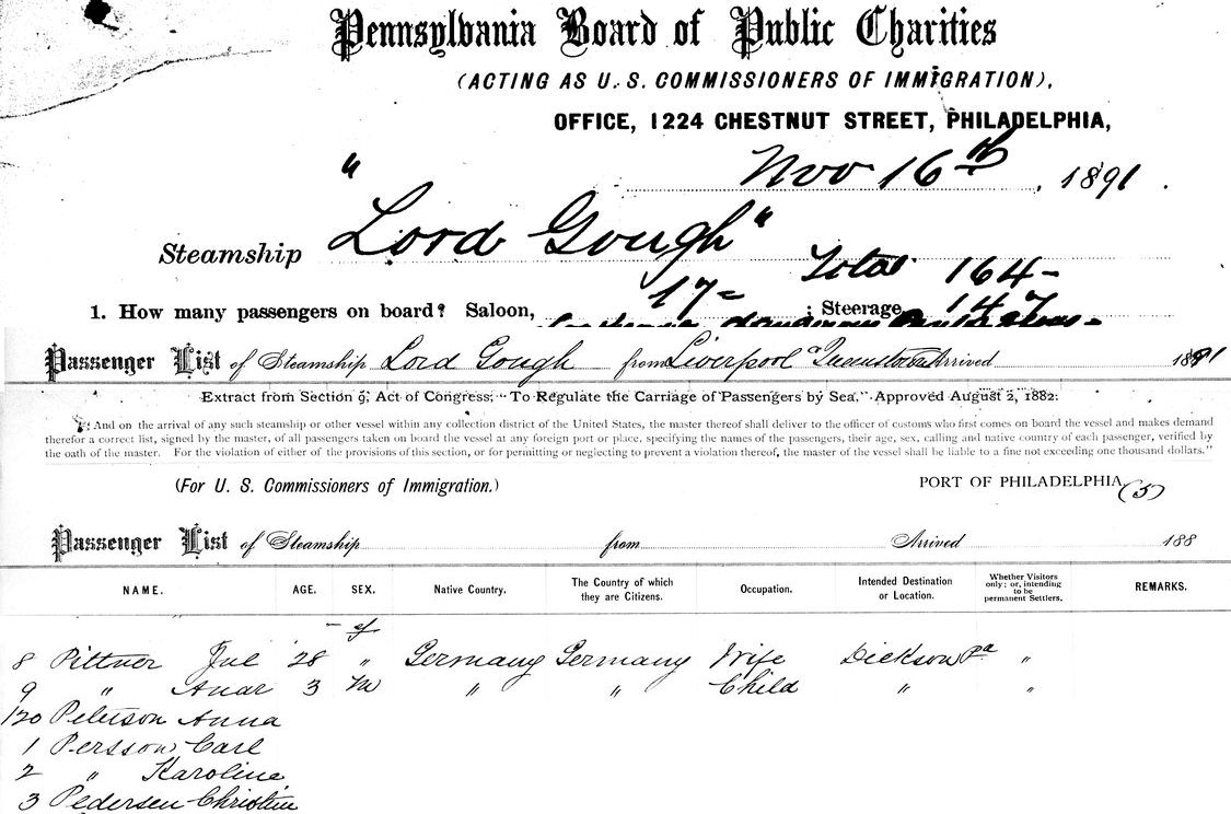Ship manifest for the SS Lord Gough, showing Julianna (Éder) Pittner [I01955], and her son Andrew Vincent Pittner [I02575]. They arrived about 16 November 1891 at Philadelphia, having sailed from Liverpool, Ireland.