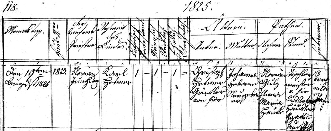 Perhaps a birth record for Karl Hattner [I01972] who would later marry Anna Maria (Pohl) Hattner [I01969]. He was born August 19, 1825.