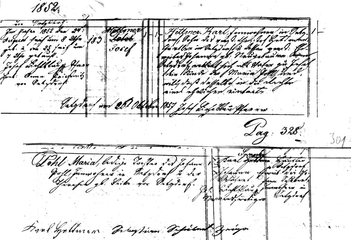 This was likely an illegitimate birth in the eyes of the Catholic Church. Anna Maria's husband was probably not Catholic and the Church did not recognize their marriage. Anna Maria eventually did officially marry Karl Hattner on 26 October 1857. This legitimized baby Josef's birth and this record was subsequently changed to reflect that.