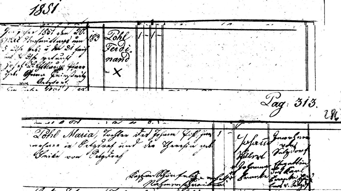 Source: Rímskokatolická fara Vápenná [The Roman Catholic rectory Vápenná], Vi VII 3, Inventory 3478, nemcina [German], 1831 - 1852, N, I-N [Births, Births Index], Zemský archiv v Opave [Provincial Archives in Opave], Vápenná, Polka, Czech Republic, Image 287, Page 313, Ferdinand Pohl, May 20, 1851.