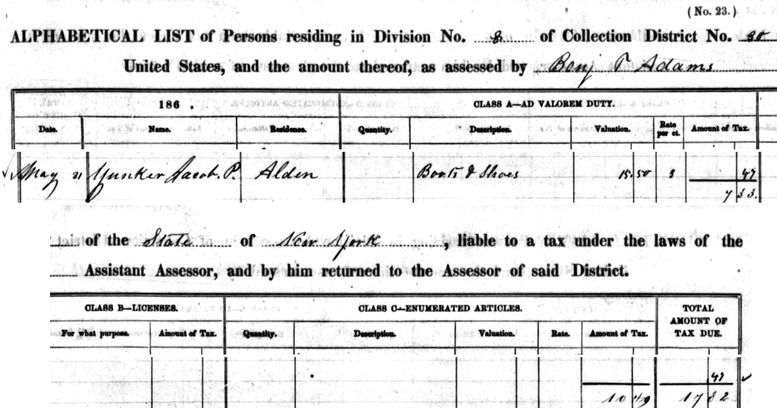 Source: Ancestry.com, "U.S. IRS Tax Assessment Lists, 1862-1918," database, Ancestry.com Operations, Inc., Anestry.com (http://Ancestry.com: downloaded 21 March 2010), Roll 202, Division 8, District 30, Alden, New York, Jacob P. Yunker; citing National Archives (NARA) microfilm series M603.
