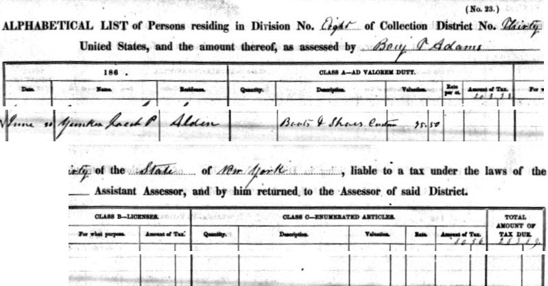 Source: Ancestry.com, "U.S. IRS Tax Assessment Lists, 1862-1918," database, Ancestry.com Operations, Inc., Ancestry.com (http://Ancestry.com: downloaded 21 March 2010), Roll 202, Division 8, District 30, Alden, New York, Jacob P. Yuncker; citing National Archives (NARA) microfilm series M603.