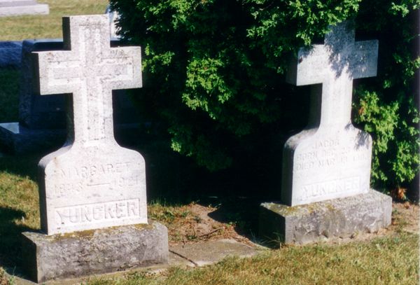 Source: "Photographs," Grave markers of Jacob P. Yuncker and Anna Margaret (Pohl) Yuncker, July 28, 2004, Beal City, Isabella, Michigan, St. Joseph the Worker Cemetery, John M. Voisin, Huntsville, Madison, Alabama.