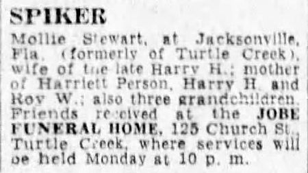 Source: "Today's Deaths," Obituary, The Pittsburgh (Pennsylvania) Press, 14 April 1962, Spiker, Page 12, Column 4; online archives (Newspapers.com : downloaded 3 July 2016).
