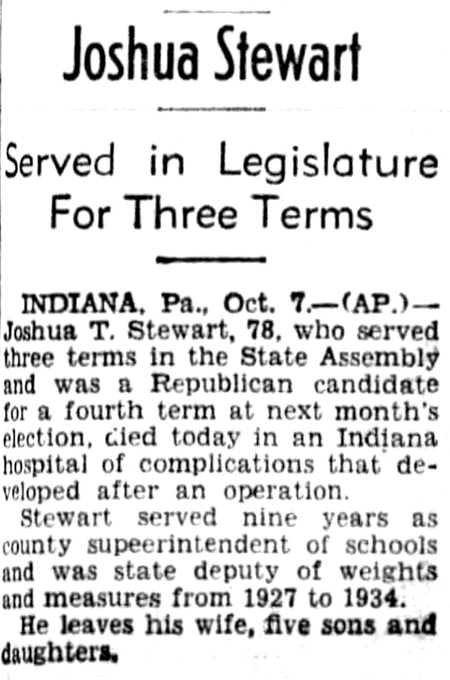 Indiana, Pa., Oct. 7 (AP) Joshua T. Stewart, 78, who served three terms in the State Assembly and was a Republican candidate for a fourth term at next month's election, died today in an Indiana hospital of complications that developed after an operation.
