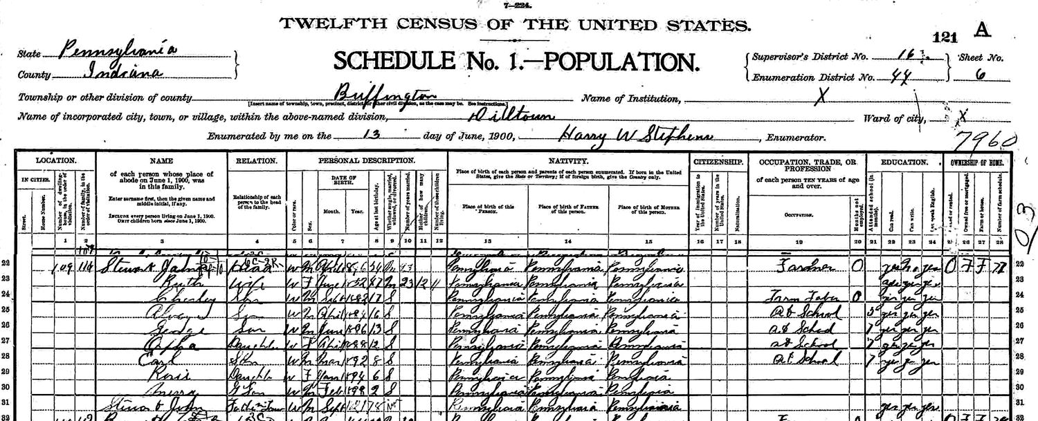 Source: 1900 United States Federal Census [database on-line]. Ancestry.com. Provo, UT, USA: Ancestry.com Operations Inc, 2004. Buffington, Indiana, Pennsylvania; Page: 6; Enumeration District: 0044; FHL microfilm: 1241415.