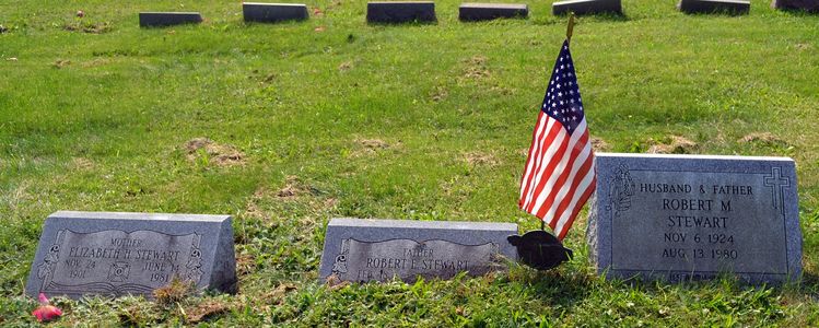 Grave markers for Robert Emanuel Stewart [I00271], Elizabeth (Hardy) Stewart [I00521] and Robert McKee Stewart [I00385].
